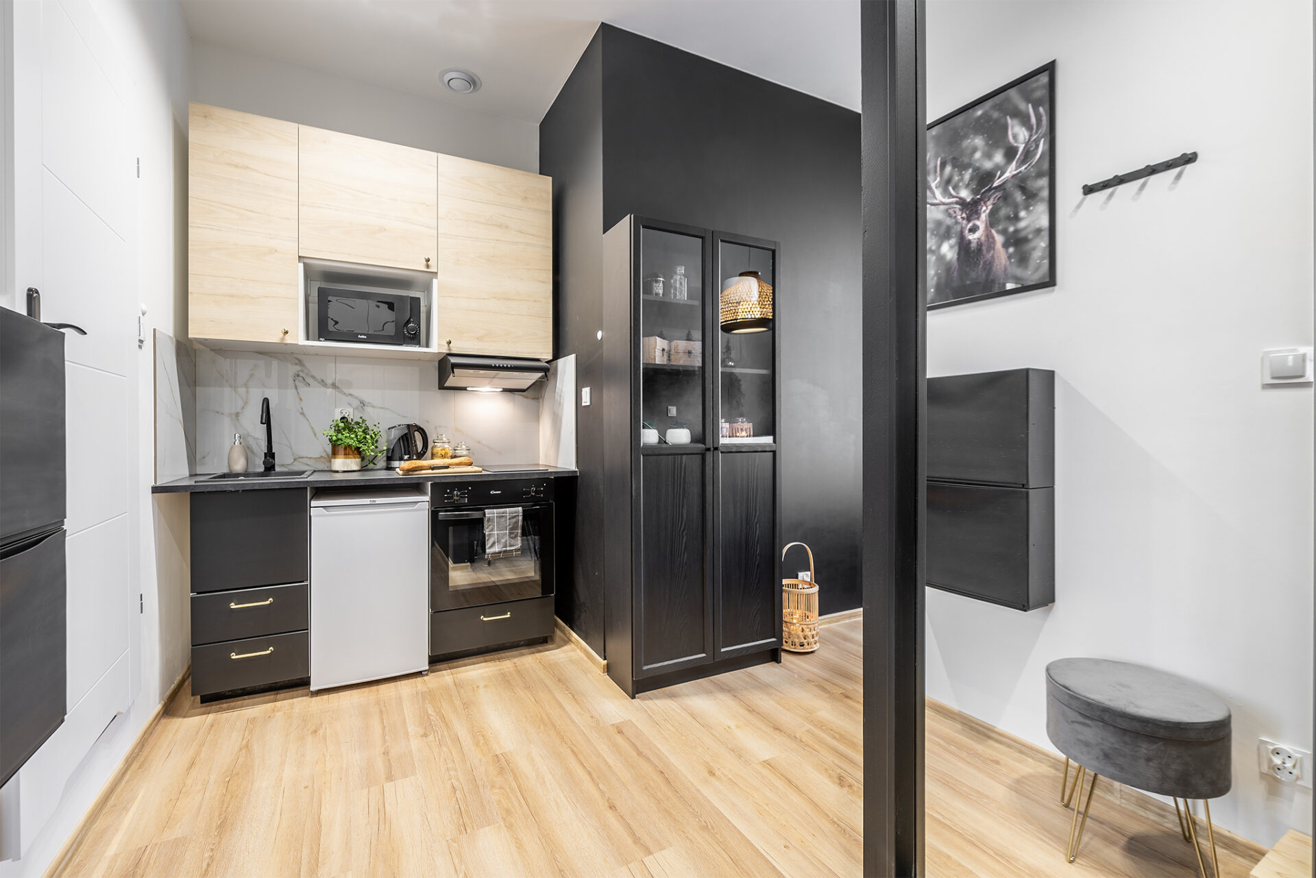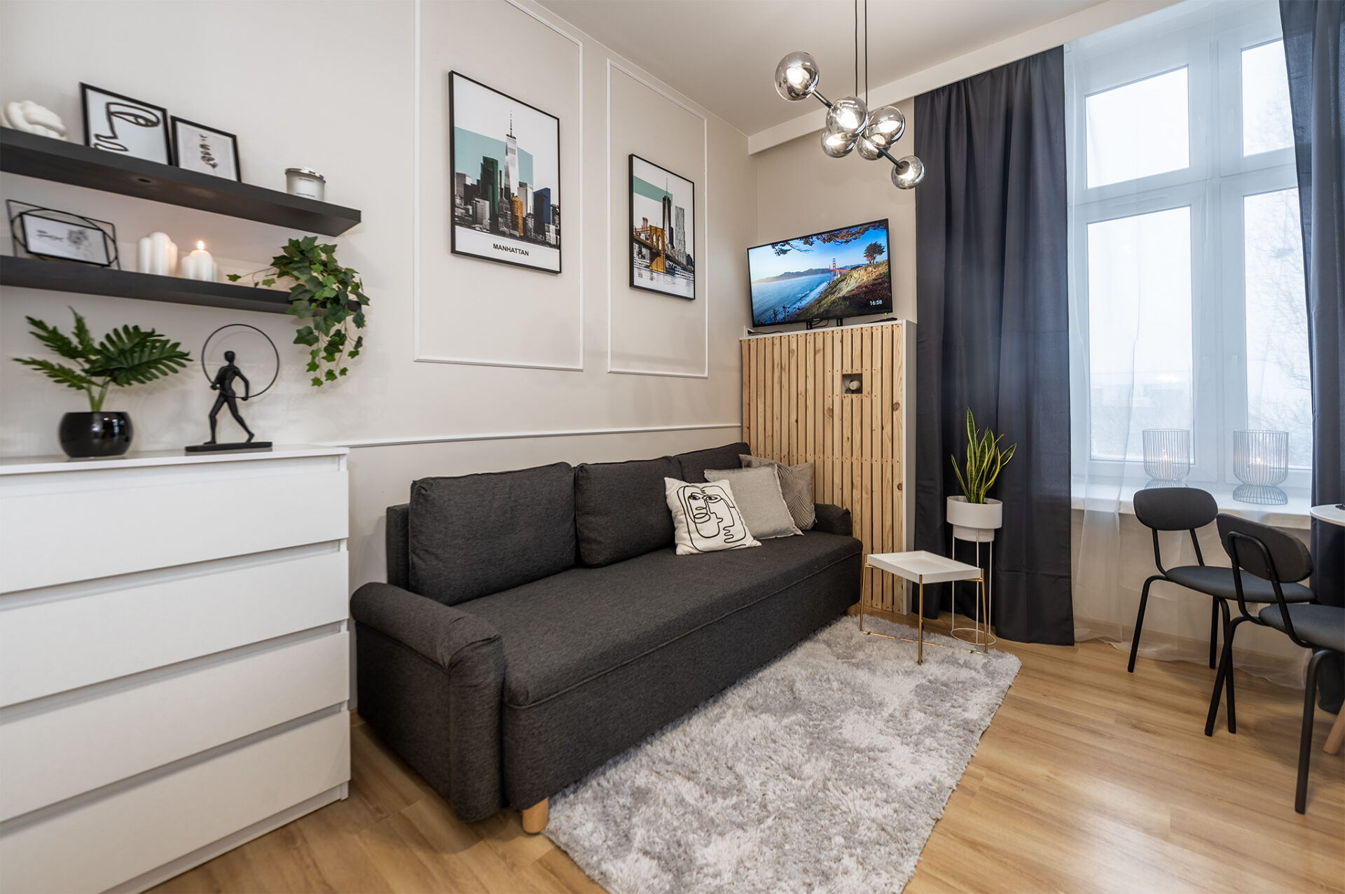 Mieszkanie znajduje się na trzecim piętrze kamienicy, jedna z kawalerek posiada balkon, a trzy pozostałe mają wystawę okien na podwórze z widokiem na sąsiednie działki, co daje poczucie przestrzeni i dużej ilości słońca w pokojach. Jedna z kawalerek posiada dodatkową sypialnię, dzięki czemu wytworzona została przestrzeń dzienna z kanapą oraz osobne łóżko do spania.