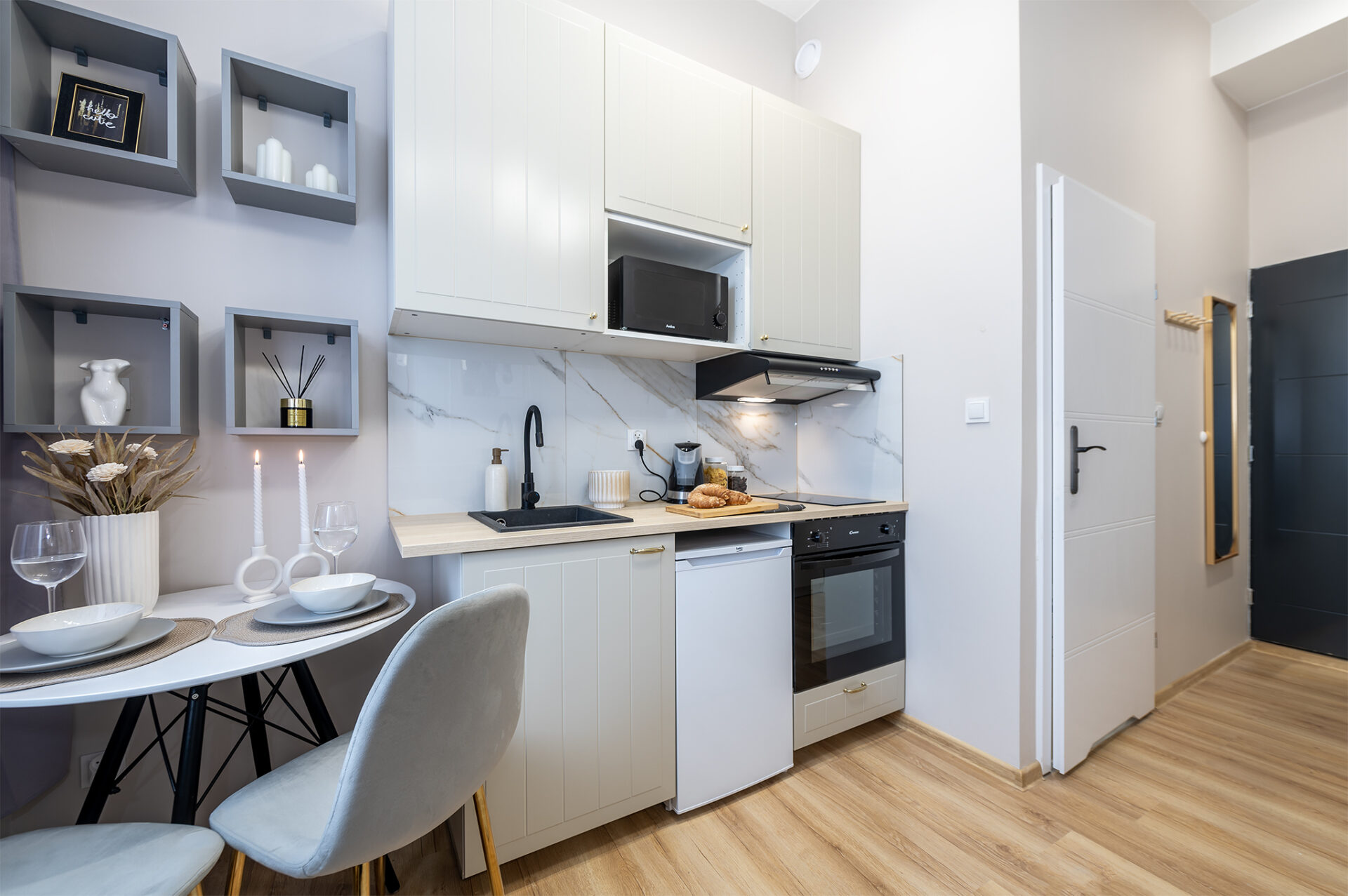 Cała realizacja została wykonana przy współpracy z projektantem wnętrz, aby wykreować funkcjonalną i piękną przestrzeń, która będzie doceniana przez najemców. Mieszkanie sprzedawane jest z pełnym wyposażeniem, w tym AGD, meblami, telewizorem (smart TV) i przyborami kuchennymi (na wyposażenie wystawiana jest osobna faktura).