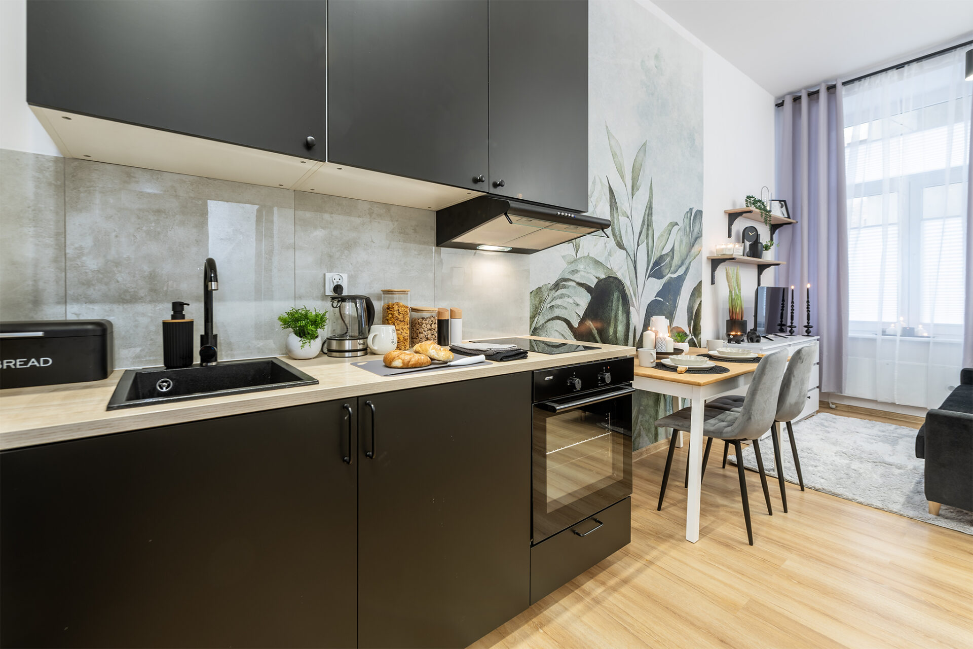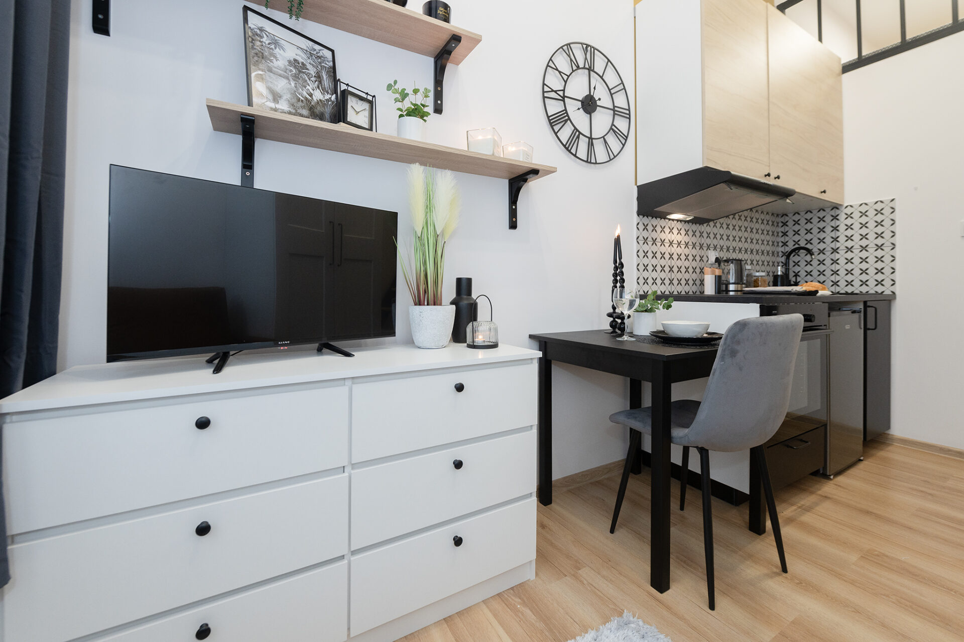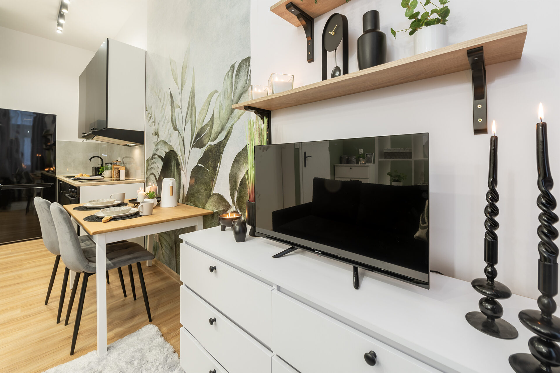 Cała realizacja została wykonana przy współpracy z projektantem wnętrz, aby wykreować funkcjonalną i piękną przestrzeń, która będzie doceniana przez najemców. Mieszkanie sprzedawane jest z pełnym wyposażeniem, w tym AGD, meblami, telewizorem (smart TV) i przyborami kuchennymi (na wyposażenie wystawiana jest osobna faktura).