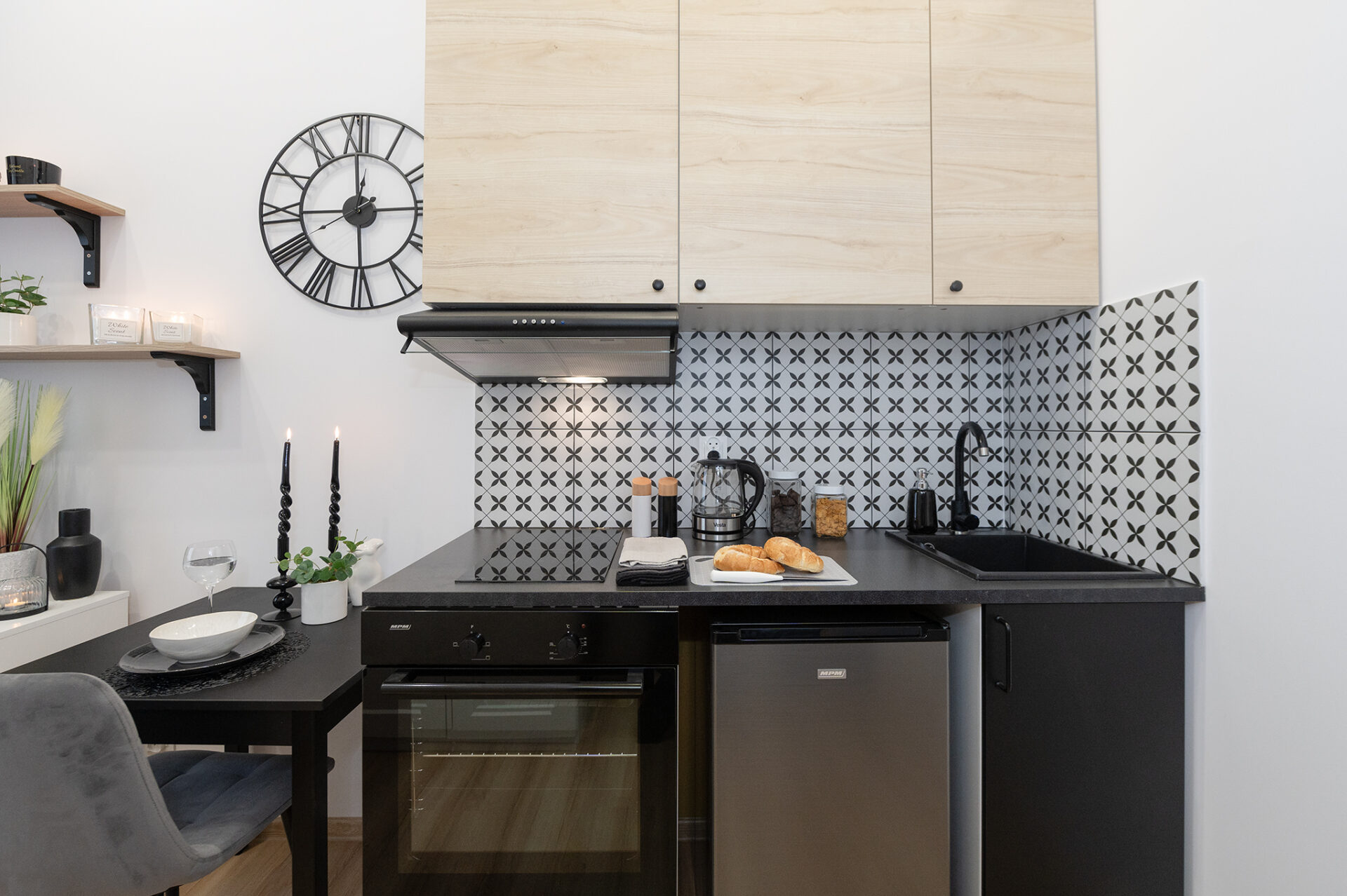 Kuchnie z Ikea, zaprojektowane pod powstałą przestrzeń i zapełnione potrzebnym wyposażeniem (jak talerze, garnki, patelnia, sztućce, deska do krojenia itd.).